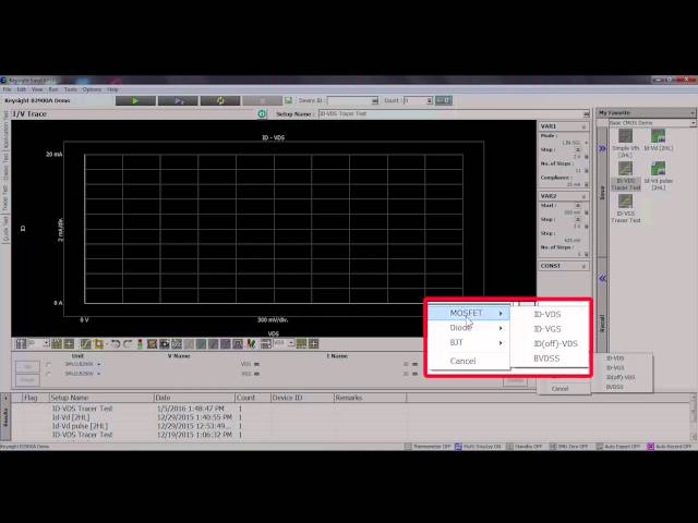 This software makes it easy to quickly setup and perform IV measurements and to display the measurement data in tables and graphs without the need to program. Using Quick IV you can control up to four SMUs, which is ideal for bench top characterization of four-terminal devices such as MOSFETs.