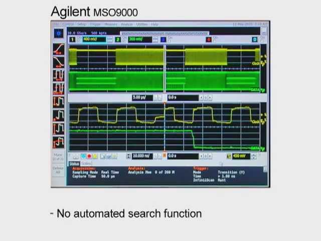 При помощи систем запуска по событиям (Pinpoint®), визуального запуска и поиска, осциллограф может быстро захватывать аномалии сигналов, в том числе глитчи, ранты, отклонения времени установления/удержания и кодовых комбинаций NRZ для потоков последовательных данных, передаваемых со скоростью до 1,25 Гбит/с.