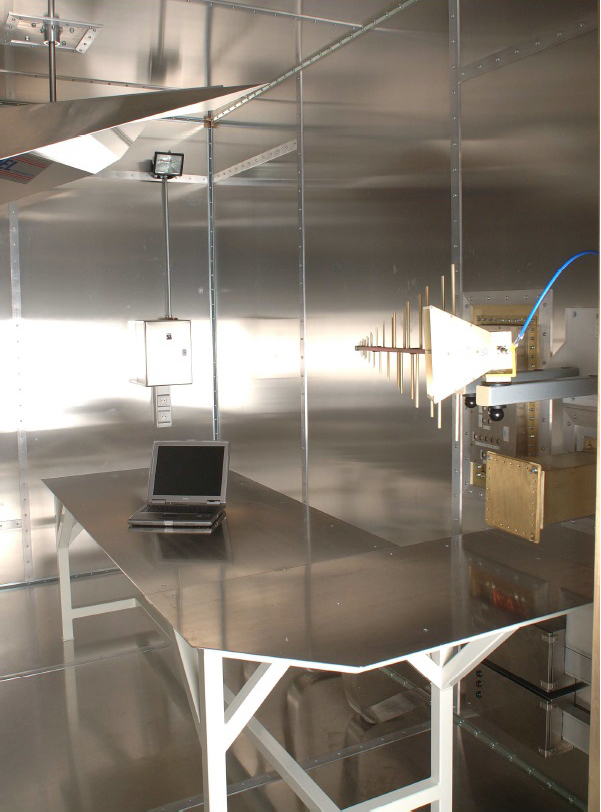 Такое техническое ограничение может быть снято за счет использования испытательного оборудования типа ревербационные камеры, поскольку одним из его наиболее преимущественных свойств является возможность получения в камере электрических полей высокой напряженности при низкой мощности падающей волны (например, 100 В/м при 1 ГГц для входной мощности в 1 Вт на разъеме антенны генерирования поля в ревербационной камере с габаритами 3,5 х 2,5 х 2,9 метра).