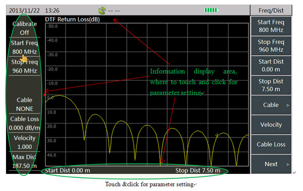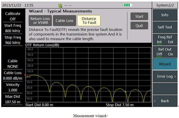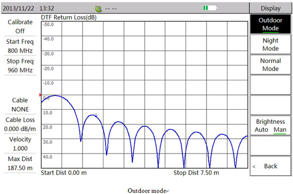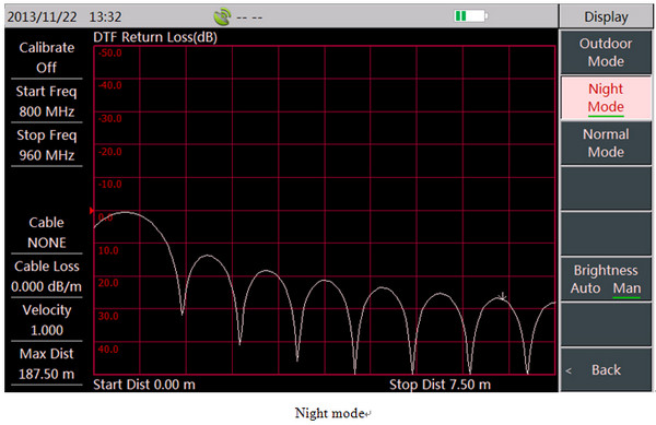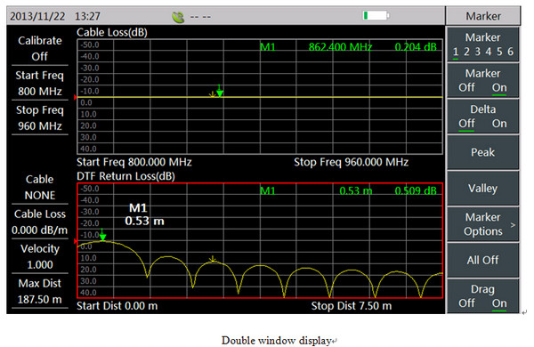 It supports 7 measurements: return loss, VSWR, cable loss, DTF return loss, DTF VSWR, Smith chart, phase. And it can conduct comprehensive measurement and fault diagnosis on cable and antenna system.