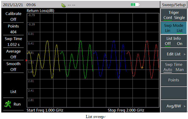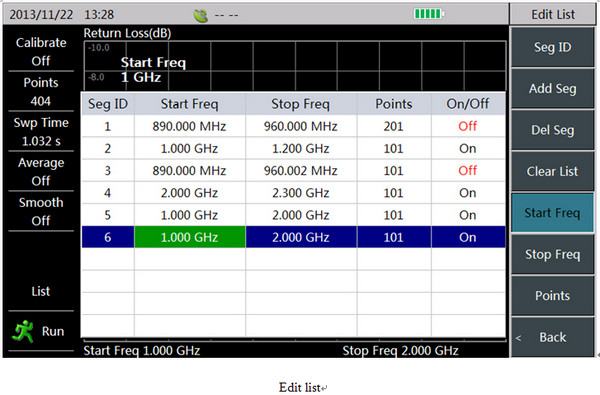 The instrument supports list sweep function. Multiple frequency segments can be simultaneously measured, and each sweep segment can be set with different points and frequency rang. The list edit is convenient: directly click the parameters to be edited. Each segment can be opened or closed through “On/Off” setting.
