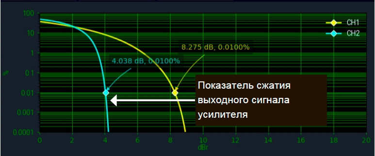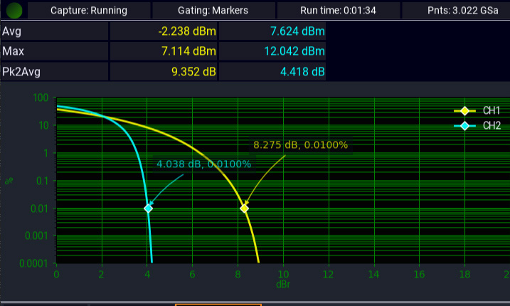 При сравнении соотношения пикового значения мощности к среднему значению или коэффициента амплитуды (CF) входных и выходных сигналов цепи радиочастотной передачи, инженеры могут оценить линейность цепи. Добавочную информацию можно получить с помощью графика дополнительной кумулятивной функции распределения (CCDF) статистического режима измерителя мощности PMX40, отображающего частоту появления конкретного CF. По мере сжатия выходного сигнала усилителя CF будет уменьшаться, а график CCDF будет перемещаться влево.