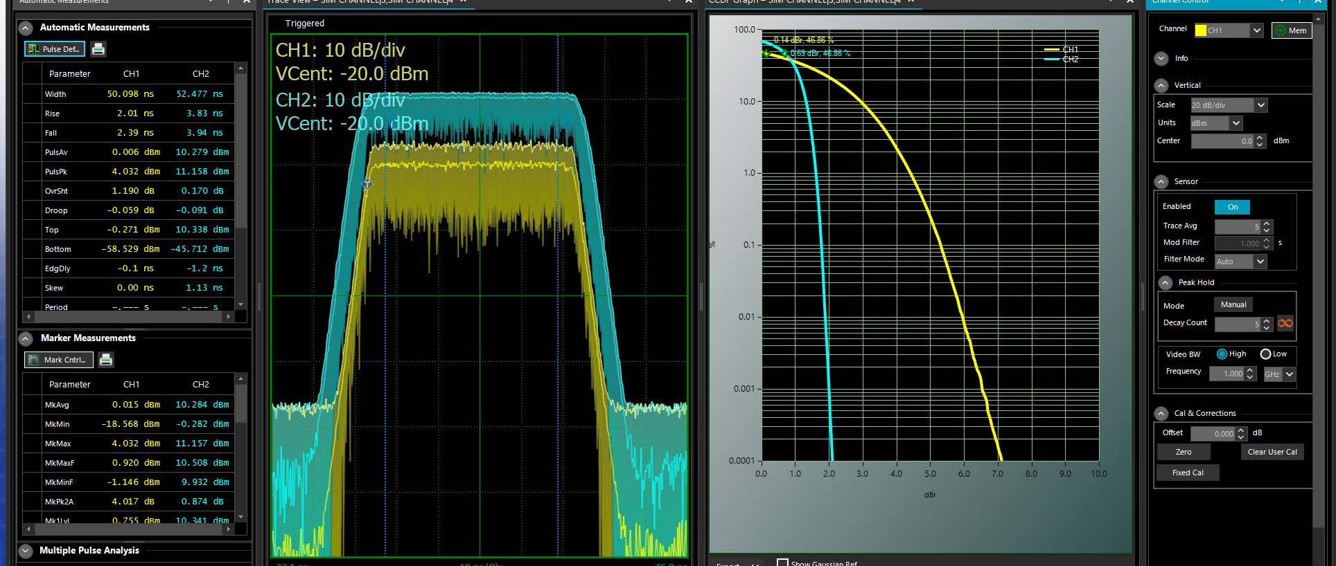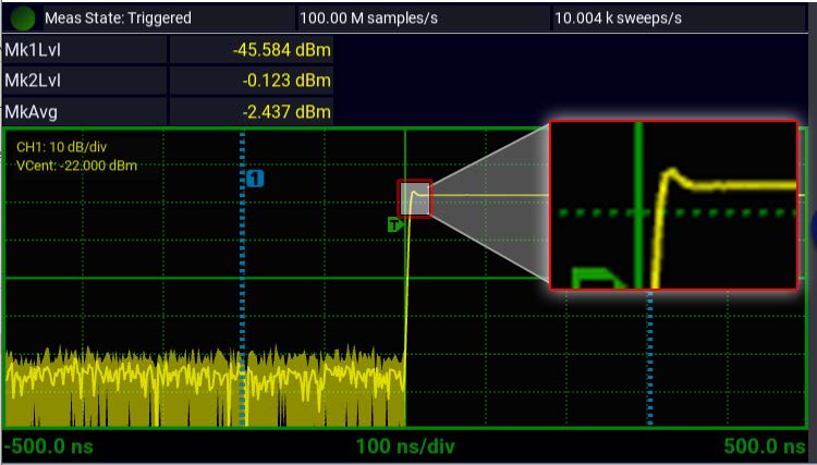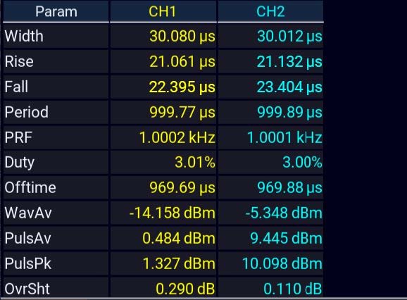 Анализ быстронарастающих одиночных импульсов или импульсов с короткими интервалами повторения (PRI) требует наличия прибора с нетривиальными возможностями запуска и сбора данных. В импульсном режиме можно измерить более 16 параметров импульса.