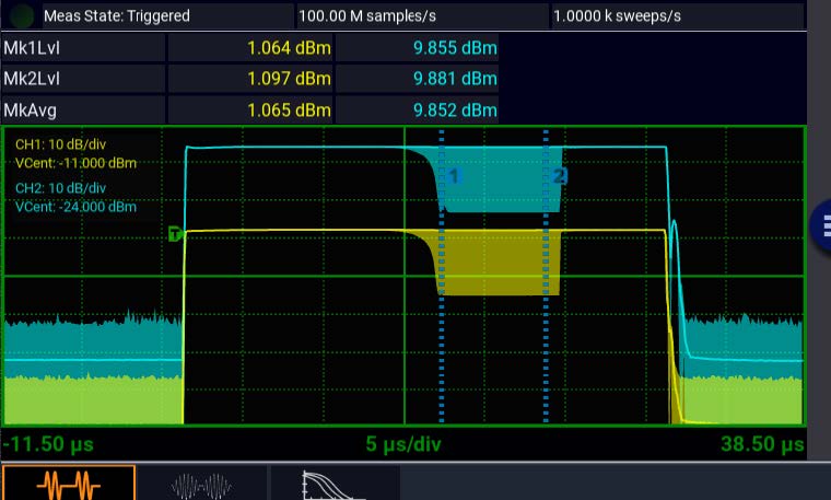 Ширина полосы видеосигнала (VBW) описывает способность датчика мощности отслеживать пиковую мощность (огибающую кривую мощности). Недостаточный VBW приведет к ошибочным измерениям огибающей и неточным значениям средней мощности. Измеритель мощности PMX40 предлагает самую широкую полосу пропускания видеосигнала (195 МГц), что делает его идеальным для измерения каналов 80 МГц, 100 МГц и 160 МГц.